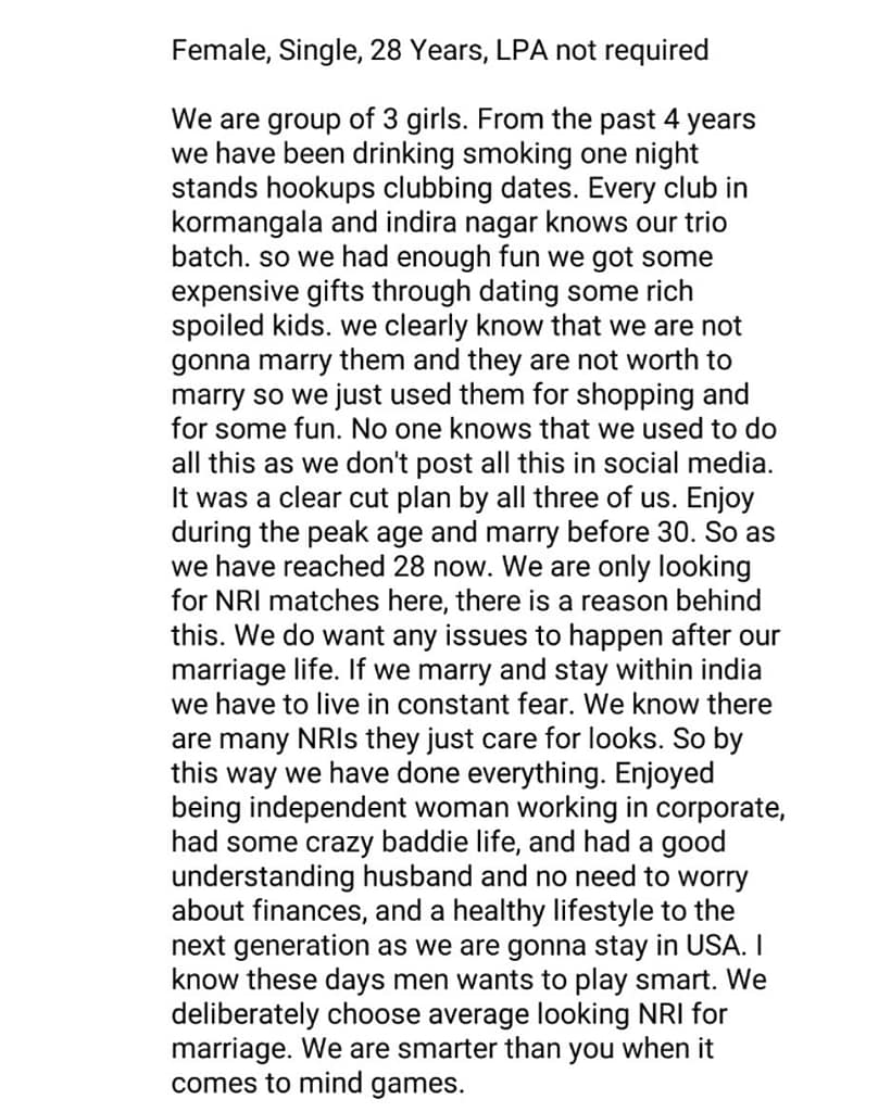 The confession claims to represent a group of women who lived a secret, party-driven life and now seek “safe” marriages with unsuspecting partners.